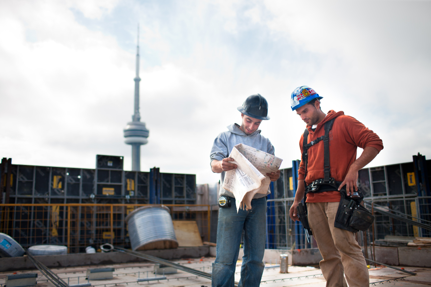 Young architects looking at blue print while standing at work site, Model: Arda Oner and Andrew Frere